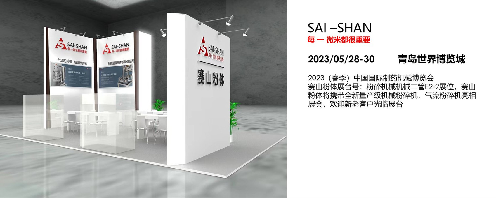 2023(春季)中國(guó)國(guó)際制藥機(jī)械博覽會(huì),賽山粉體展臺(tái)號(hào):粉碎機(jī)械機(jī)械二管E2-2展位,賽山粉體將攜帶全新量產(chǎn)級(jí)機(jī)械粉碎機(jī),氣流粉碎機(jī)亮相展會(huì),在以上設(shè)備集成了賽山粉碎的比較新功能單元,歡迎新老客戶光臨展臺(tái)。